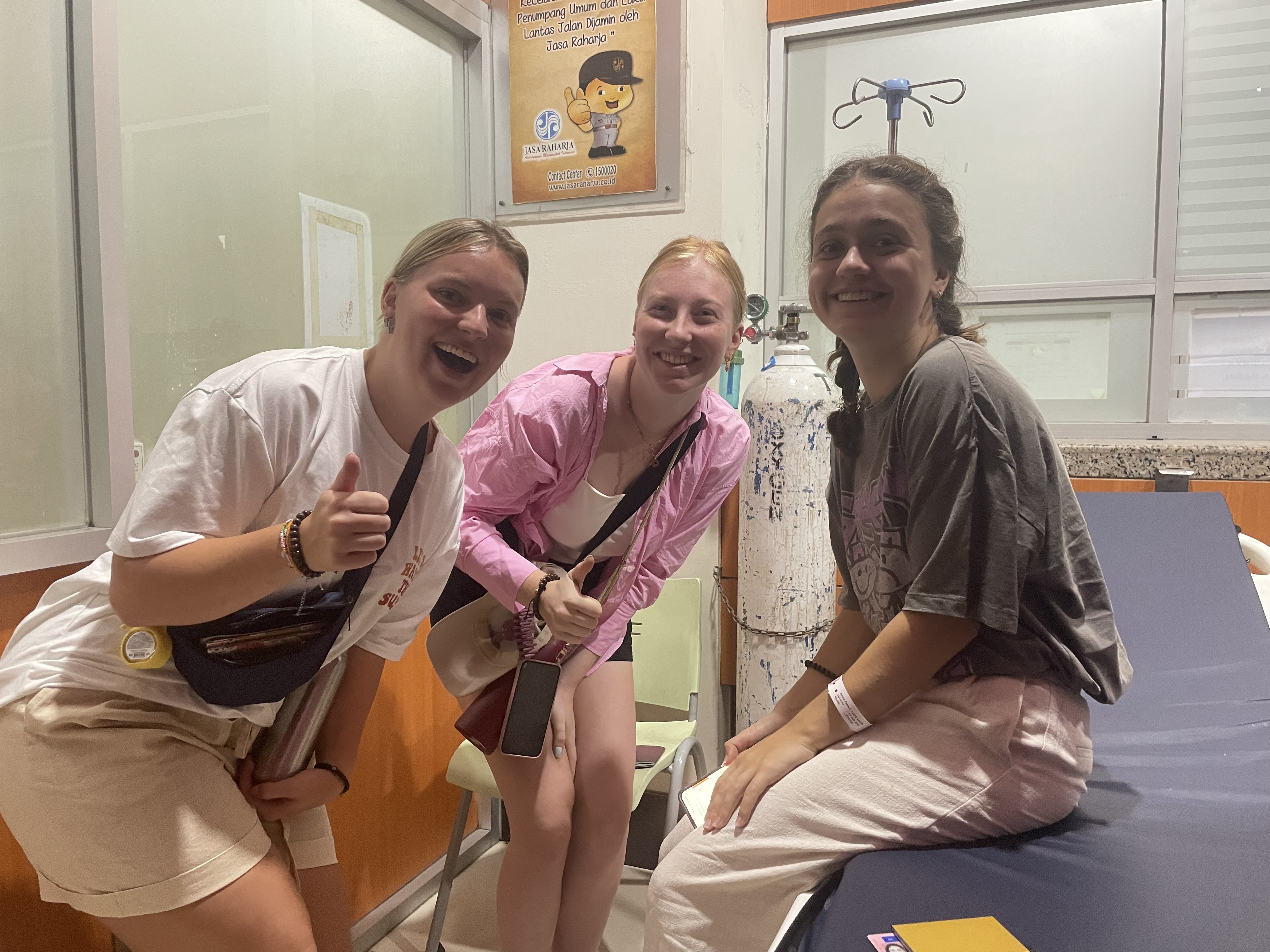 Gisteren was een iets spannendere dag. We zijn in de ochtend naar het ziekenhuis moeten gaan, omdat Lieke een keelontsteking had die niet over ging. Gelukkig was de baas van ons hostel zo lief om ons te brengen en mee naar binnen te gaan om te vertalen. We waren allemaal natuurlijk best bang en gestresst, maar we moeten wel aan de herinneringen denken dacht ik. Dus om de mood wat op te vrolijk en dacht ik we maken een foto. De man van het hostel vond het ook een goed idee, dus heeft toen van ons een foto gemaakt. Hierdoor lagen we helemaal dubbel en hebben we de tijd even gedood toen we op de arts wachtten. Het ging gelukkig allemaal super snel, de arts was heel aardig en Lieke kreeg de juiste medicijnen mee naar huis. Nu gaat het al een stuk beter met haar.