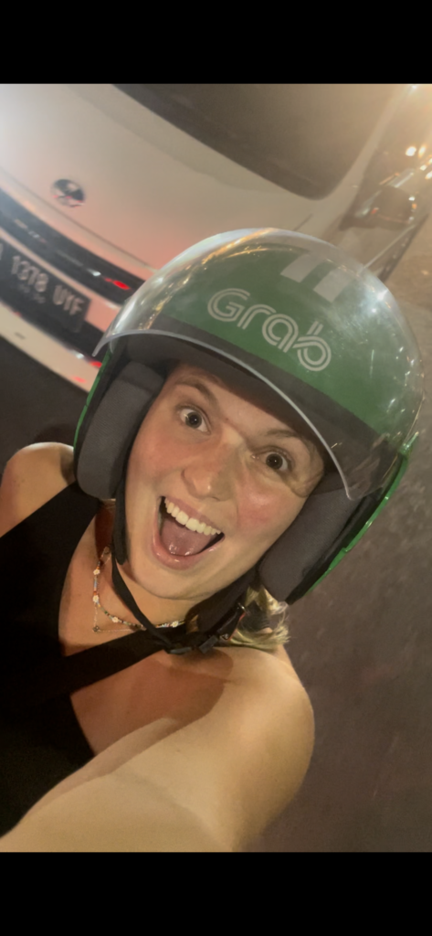 Om af te sluiten nog even een leuke foto om te laten zien hoe we ons hier vaak voortbewegen, achter op een Grab bike. Super snel en makkelijk!